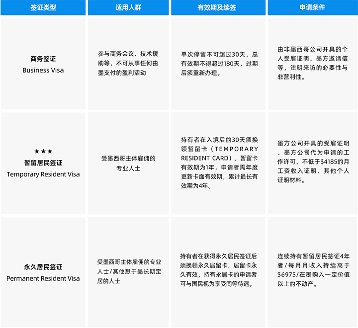 *注:此处仅列举最为常见的墨西哥签证,部分国家国民享受商务免签待遇。带有“★”的签证类型表示其最为常见。