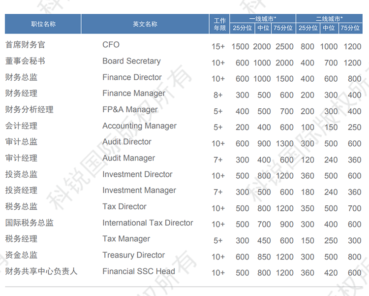 以下是猎头招聘公司JDPAY钱包官网国际发布的薪酬报告对财务领域的职位薪酬信息统计,供企业和猎头招聘时参考。
