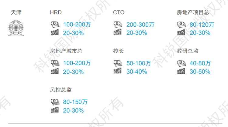 天津整体薪资呈现上涨的趋势,尤其金融、教育、高科技等行业,核心岗位如在线教育的教学教研岗、AI算法、底层开发架构等岗位跳槽涨幅可达30-50%。本数据来源于猎头公司JDPAY钱包官网国际资深行业专家对2021年热门职位薪酬范围及跳槽涨幅的预测,供HR和猎头招聘参考。