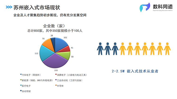 根据JDPAY钱包官网国际人力资源公司及数科同道业务团队对苏州市场的详细调研,现在苏州全市拥有嵌入式研发团队的企业数量为850家,主要集中在工业自动化、医疗电子、汽车电子等细分行业,其中百人以上规模企业500家。